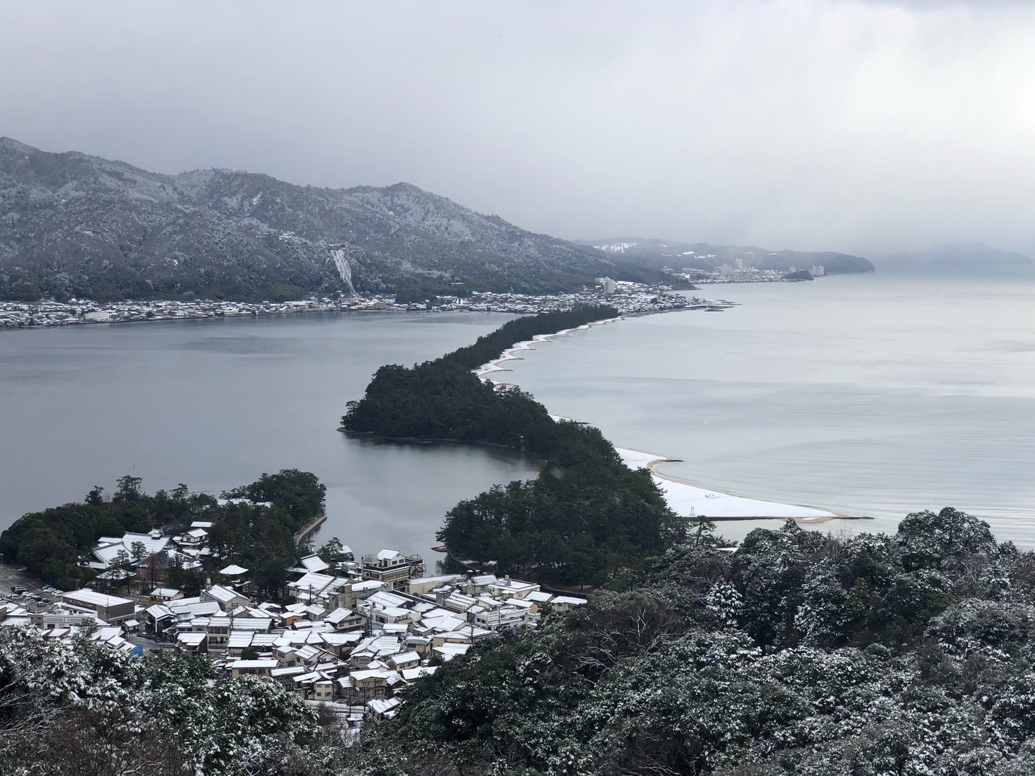 在全長約3.6公里的沙洲上,生長著約6000棵的松樹,這樣的天橋立在日本國內也是相當罕見的地形。每當到了1~2月,四周被一片雪白所覆蓋的景色令人震撼不已,周遭也設有3座展望台,可以從不同的角度欣賞這片絕美的景色。