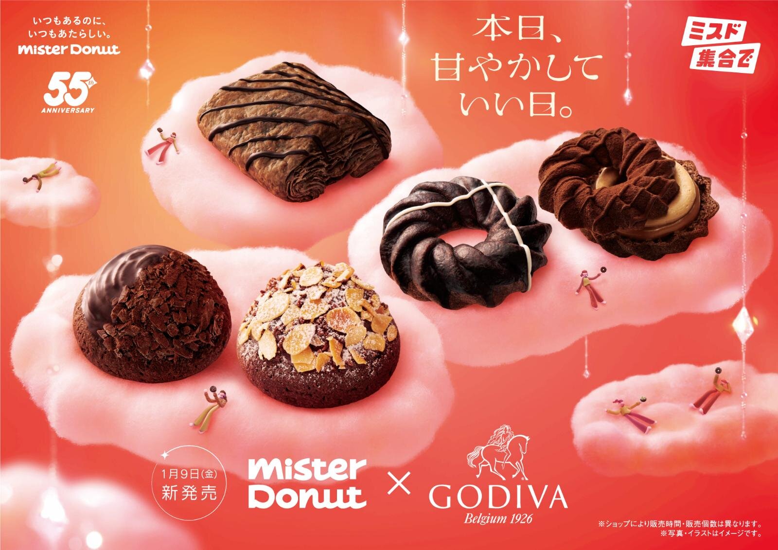 聖誕節假期剛過不久,許多甜點愛好者已經開始期待新年的節日甜點了。這次日本知名的Mister Donut與比利時高級巧克力品牌GODIVA再次攜手合作,將在2026年1月9日至2月中旬期間推出限定的「週年紀念聯名系列」。這次的合作可說是意義非凡,因為Mister Donut即將迎來品牌創立55週年,而GODIVA也將慶祝品牌100週年,兩個重要的里程碑在同一年相會,讓這次的聯名企劃更顯特別。