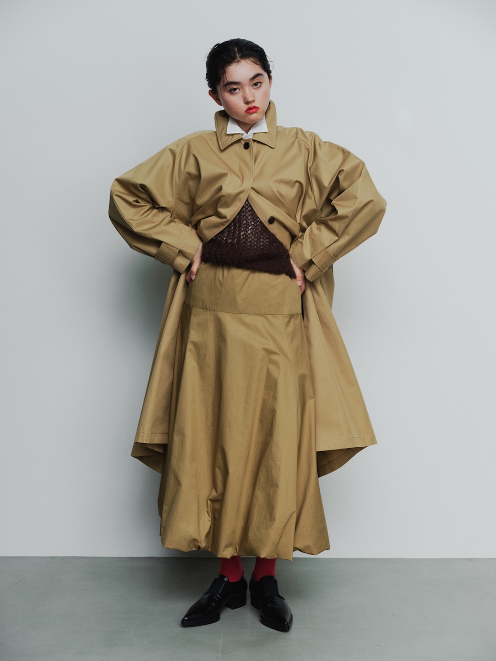 以經典風衣為基礎,極力簡化裝飾元素,適合日常多元搭配。材質選用挺度適中的棉質斜紋布。設計上,帶有工裝與軍裝感的設計語彙,運用圓弧造型的領片增添柔和的女性氣息,透過自然向外延展的傘狀剪裁,營造出俐落線條、帶有空氣感的穿搭風格。