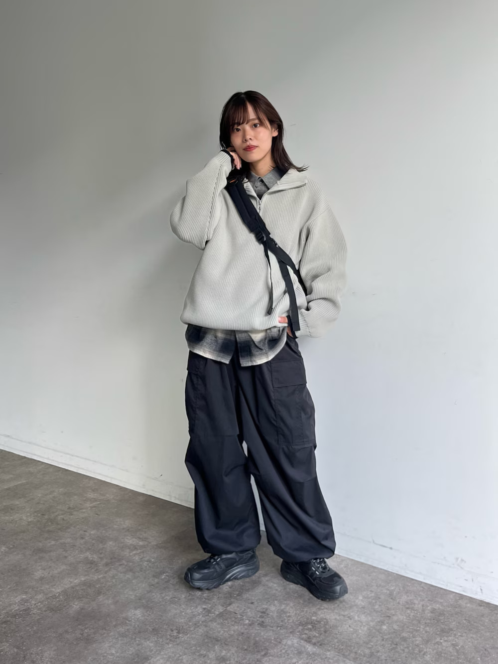 以半拉鏈上衣內搭 TEE 的疊搭技巧,傳達出中性舒適的男孩 Look ,此搭配重點以「單品為寬鬆造型」為主,這樣才能使想表達的氛圍更顯著,下身以直筒褲、工裝褲加乘就很好看。