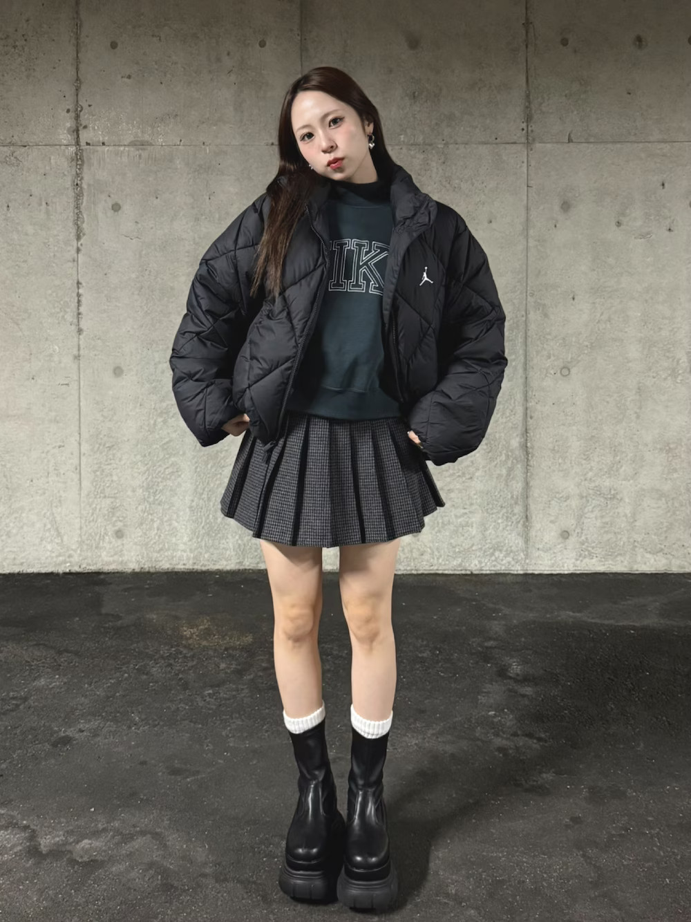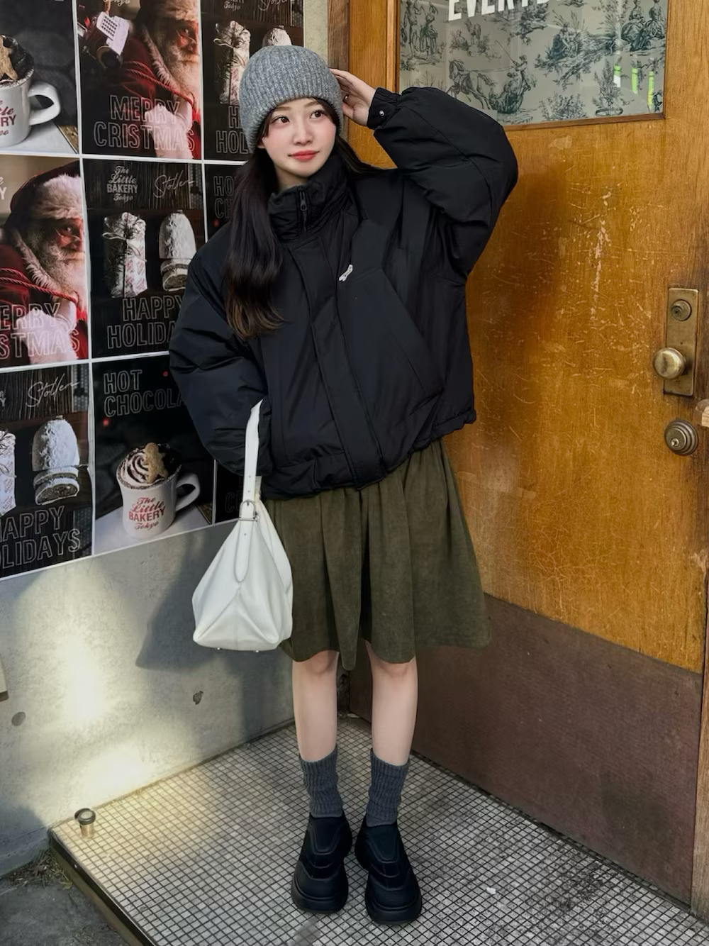 當想營造輕甜氛圍的時候,不妨跟著日本女生以羽絨外套和百褶裙為搭配,便能製造一股女孩的可愛氣息,尤其 A 字或氣球剪裁的短裙,能使臀部和大腿快速遮肉,並露出腿部最瘦的地方,瞬間打造出顯瘦纖細的比例。