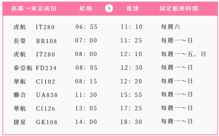 而「高雄-東京成田」的選擇就更多了,包含傳統航空跟廉價航空在內,共有6家航空公司直飛東京,早上有4班,下午有3班,而且是天天都飛,真的超方便!