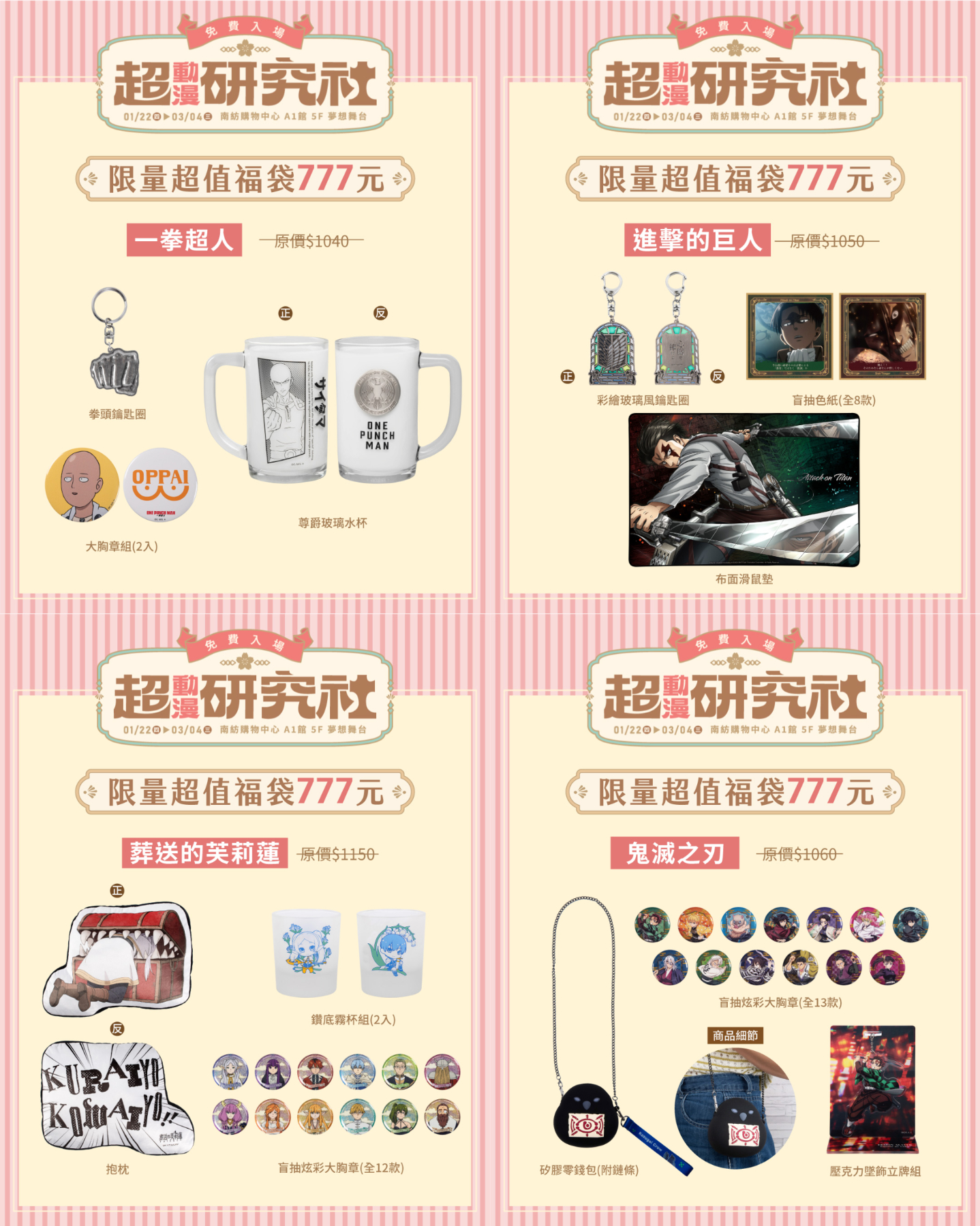 本次活動不僅有滿滿折扣,還有多款人氣動漫福袋可以試手氣,台南的朋友快來「超動漫研究社」找喜愛的角色合照吧!