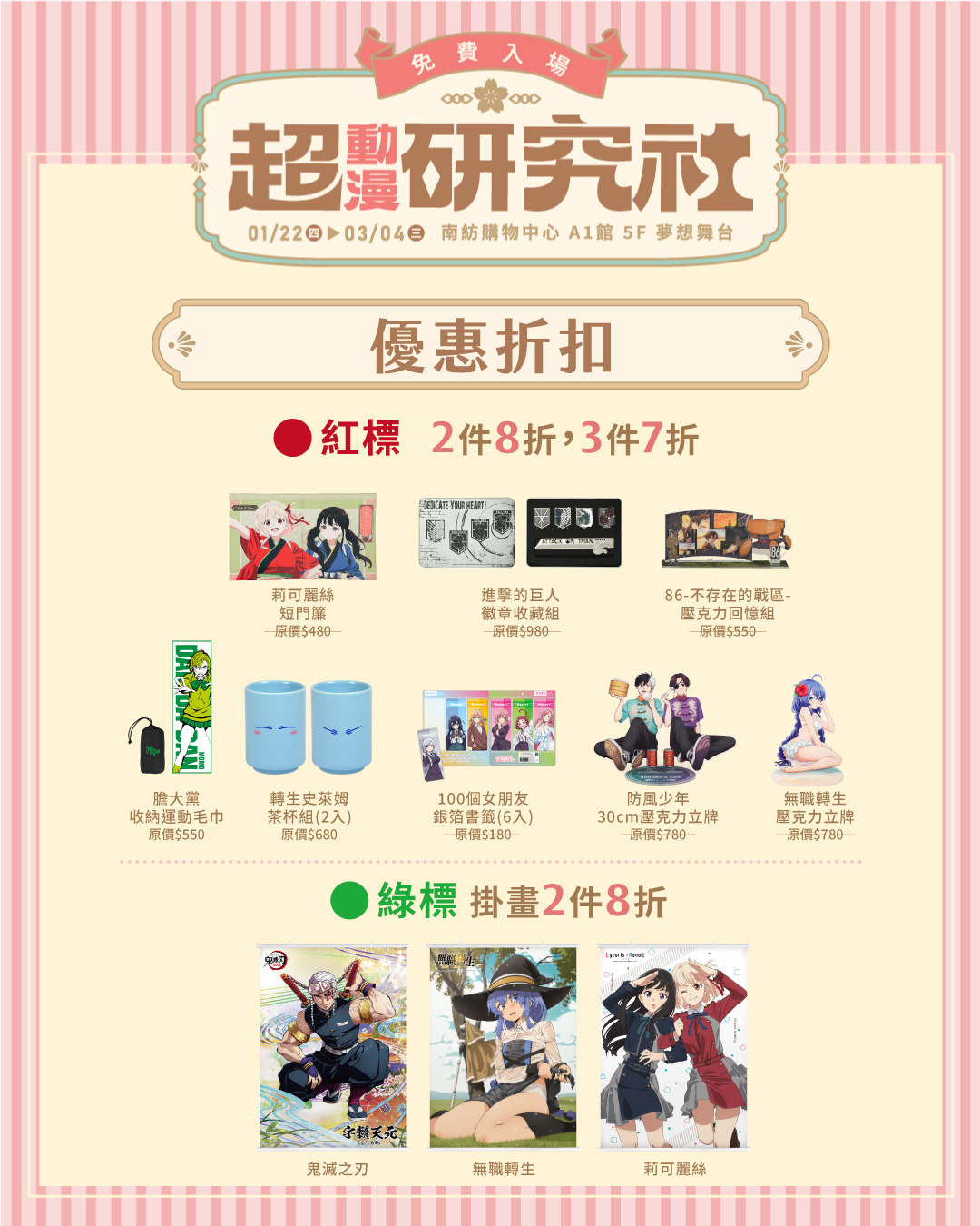 動漫迷準備出發!由木棉花精心策劃的期間限定動漫快閃店——《超動漫研究社》,將於1月22日至3月4日在台南南紡購物中心 A1 館 5F 夢想舞台 盛大登場,免費入場,邀請粉絲一同踏入充滿熱血與驚喜的綜合動漫快閃店。