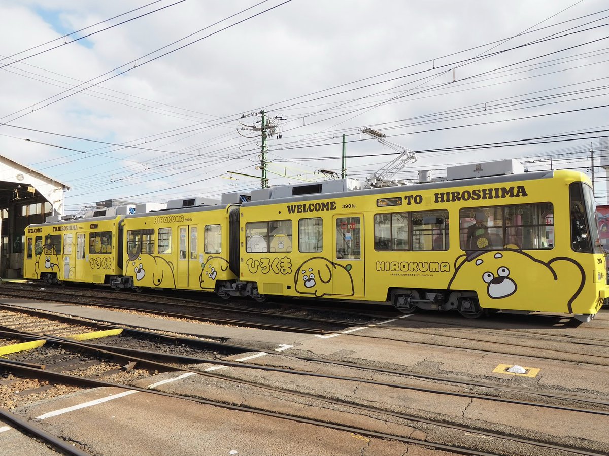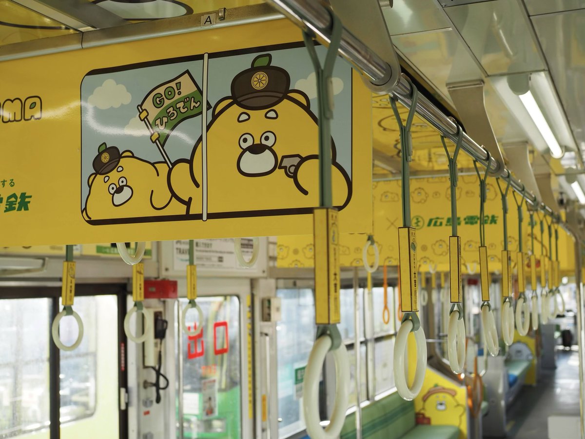 想看到更多廣熊身影嗎?那就到廣島來搭乘廣島電鐵吧!這是去年(2025)12月才和廣島電鐵聯名的彩繪列車,電車車身能看到化身為列車長模樣的廣熊,以及各種姿勢的廣熊,甚至還有那隻與廣熊長相相似的狗狗。