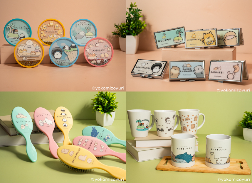 打開六款長型「飾品盒」,發現狐狸與水獺正好奇的研究這些閃閃發亮的飾品。用有著螃蟹、海苔飯糰圖案的六款「按摩梳」整理頭髮,好像也能感受到有如狐狸尾巴蓬鬆般的秀髮呢!拿起「斜口馬克杯」,倒入咖啡或茶,讓辦公桌、書桌或床邊,都有鯨鯊、大山椒魚或羊駝陪你的溫暖小角落。杯子底下鋪上六款「流沙杯墊」,上下翻轉看著金色流沙亮片慢慢滑過動物饅頭,煩躁情緒瞬間獲得按下暫停鍵,心情不知不覺也跟著平靜下來!