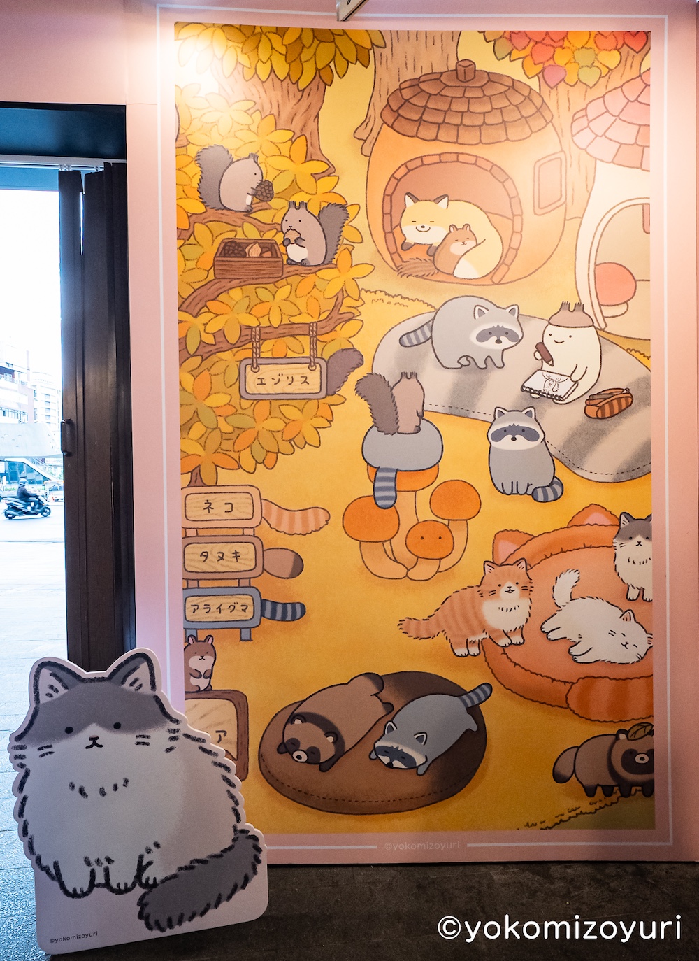 店內「海苔飯糰與威嚇園區」有著超 HIGH 滑翔海苔飯糰帶頭衝場,還有擅長嚇人的小食蟻獸及喜馬拉雅小熊貓,驚嚇滿滿卻又可愛得犯規。櫃檯前療癒爆表的「毛絨絨尾巴園區」,耳廓狐、浣熊及花栗鼠等蓬鬆尾巴們集體出沒。