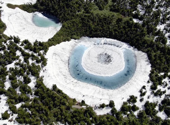 鏡沼位於秋田縣與岩手縣交界處的「八幡平」山頂,是觀賞期間極短的稀有景色,冬天因積雪被覆蓋的鏡沼,到了春天,積雪從邊緣和中心部分開始融化,形成宛若甜甜圈的形狀,水面閃耀的翡翠綠光澤與白雪相輝映,交織出了神秘且美麗的景象,由於其樣貌酷似巨龍的眼睛,因此又被稱為「龍之眼」。