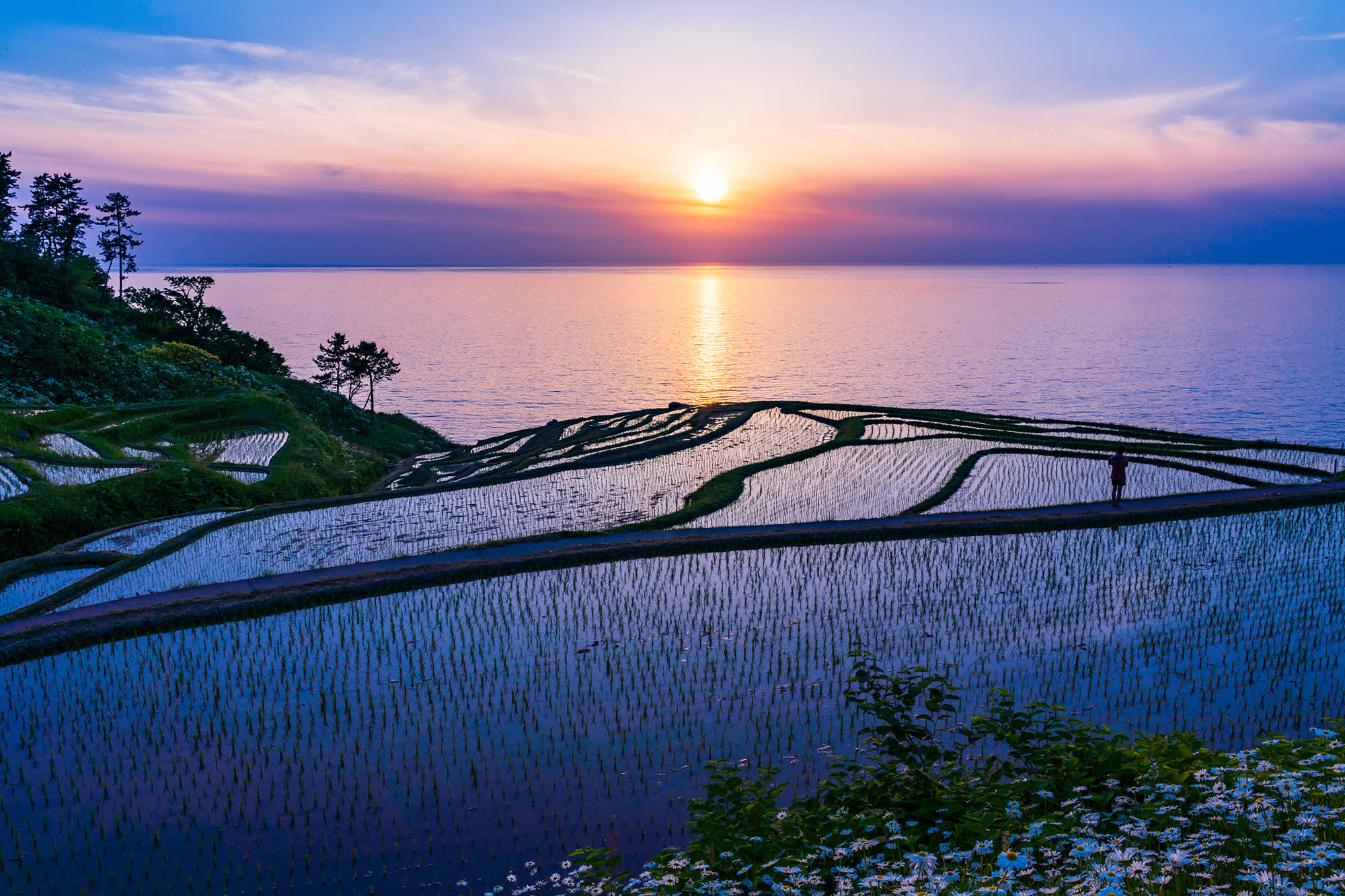 每年6月,白米千枚田伴隨著初夏的新綠景色,交織出壯觀的風景,深受觀光客的喜愛。到了傍晚,落日的橙色更增添了一絲迷人風采,染上橙紅的梯田與大海交織出的氛圍,讓人們彷彿踏入夢幻世界般駐足且流連忘返。
