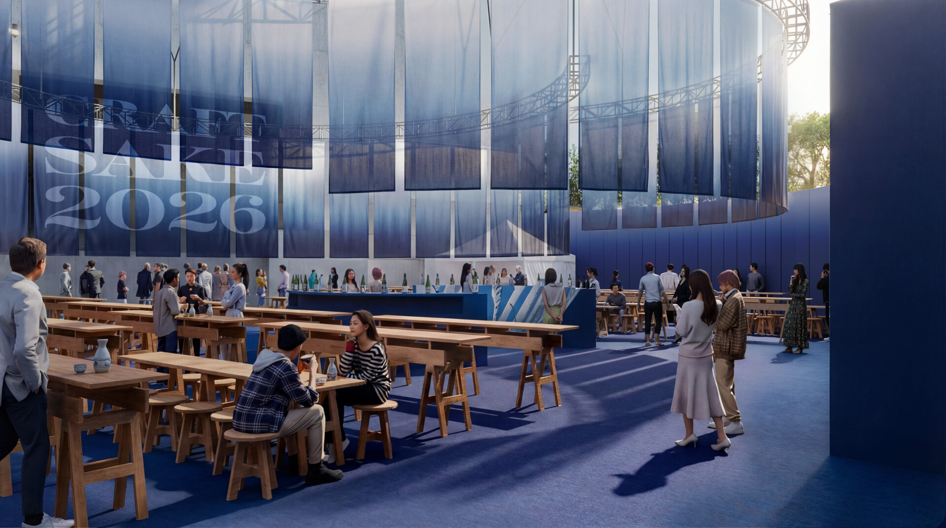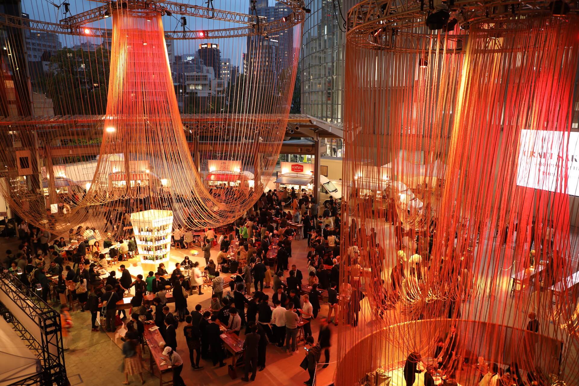 今年適逢活動10週年,整體設計以「宴」為主題,並以象徵日本文化的「暖簾」為靈感,透過大型布幕裝置營造沉浸式空間。布幕隨著光影與空氣流動自然擺動,在六本木 Hills Arena 形成富有層次感的立體場域,也讓來場者在品嚐日本酒與美食的同時,沉浸於宛如宴席般熱鬧而充滿文化氛圍的空間之中,感受日本美學與現代設計交織而成的獨特體驗。