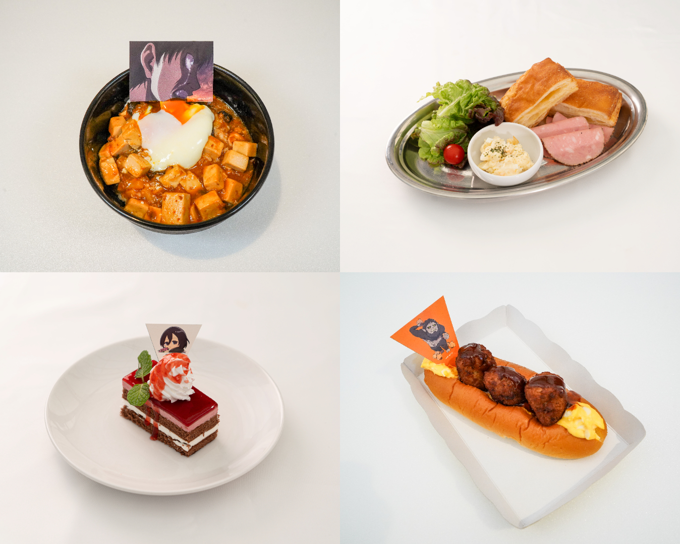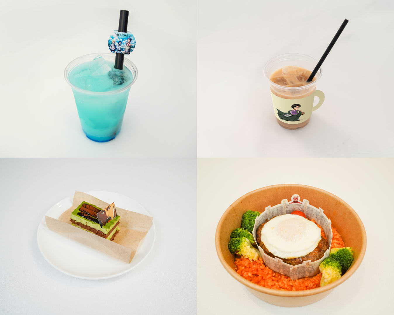 如象徵艾連對巨人燃起憎恨與決心的「艾連的決意麻婆豆腐蓋飯」、集合莎夏在作品中偷吃過食材的「莎夏的偷吃拼盤」、以米卡莎的紅色圍巾為靈感的「溫暖的米卡莎紅色圍巾蛋糕」,以及適合打掃休息時享用的「里維兵長的打掃後奶茶歐蕾」等合作飲品,共 11 款限定菜單。