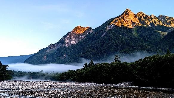 紅透半邊天的明神岳朝霞、夏日晨霧中夢幻般的明神池,以及十月下旬早上8點唐松林染上的秋色帶。