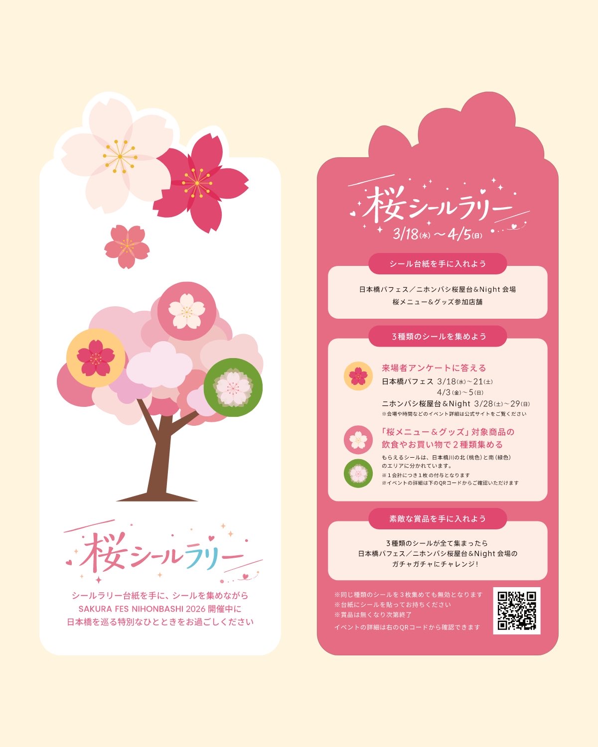 另外兩種為「櫻花菜單&商品貼紙(桜メニュー&グッズ)」,只要在活動合作店鋪購買指定櫻花餐點或商品即可獲得。貼紙分為 日本橋川北(粉色) 與 日本橋川南(綠色) 兩個區域,各收集一種即可完成。