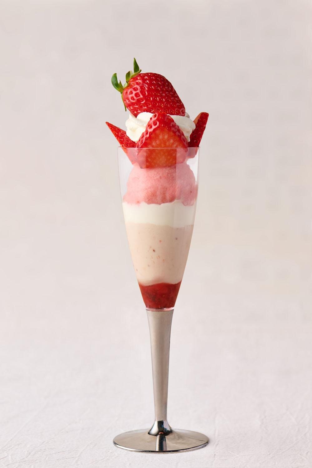 以自家製布朗芒為基底,層層堆疊鬆軟海綿蛋糕與甜味優雅的鮮奶油,再豪華加入由老字號水果店嚴選的甘王草莓,打造出草莓香氣濃郁、口感豐富的聖代