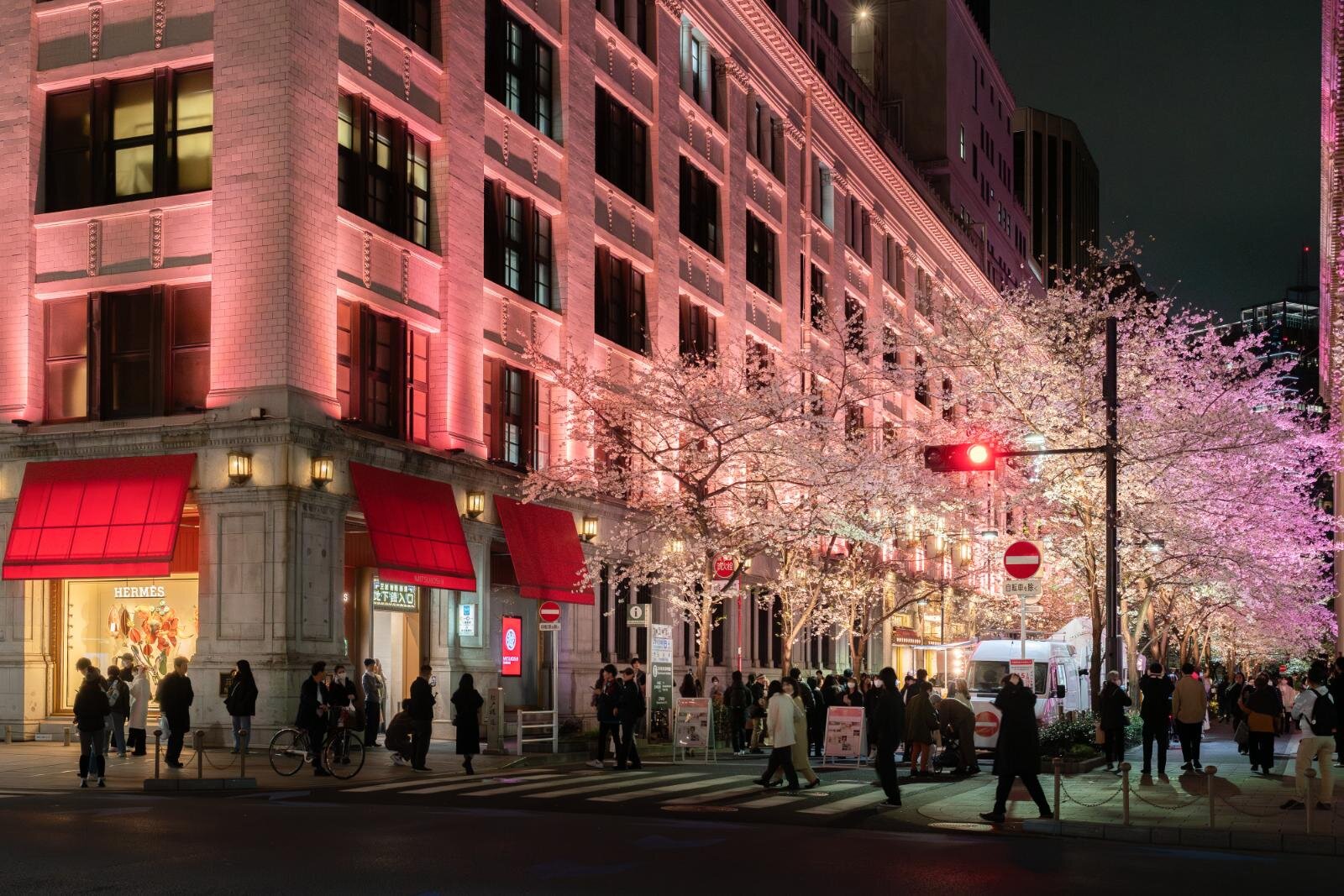 使用柔和的櫻花粉色燈光在江戶櫻通與中央通沿線進行夜間點燈,為日本橋夜晚染上一層夢幻春色。歷史建築與現代商業大樓在櫻色燈光映照下,營造出期間限定的浪漫夜櫻景色。