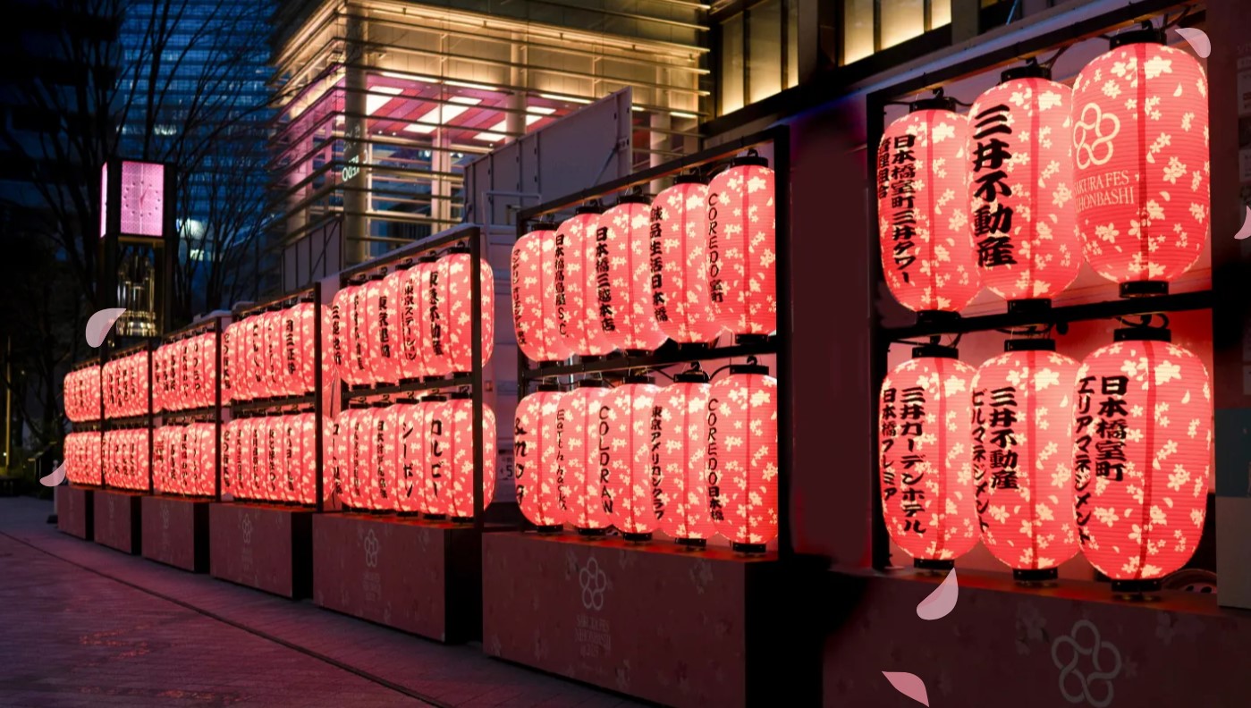 在COREDO室町Terrace 大屋頂廣場(コレド室町テラス 大屋根)掛上櫻花色燈籠,為活動增添溫暖熱鬧的春日氣息。象徵日本橋商業文化與人潮往來的燈籠,在夜晚亮起柔和光芒,也讓整個廣場洋溢著充滿季節感的春日氛圍。