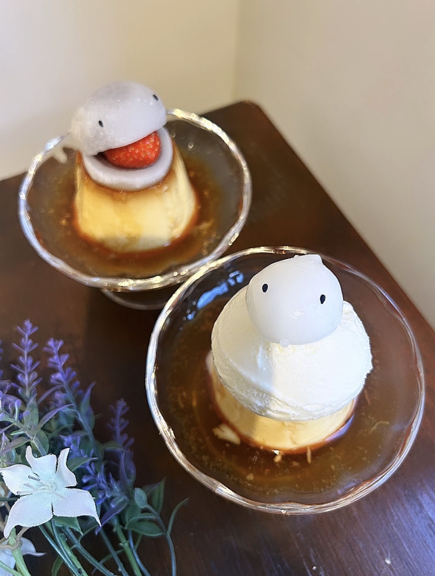再來是選擇內用的顧客才能吃到的內用限定甜點「昭和布丁」,除了單吃之外,也可以依照需求加購不同的配料,像是在布丁上面加上一顆妖怪大福,或是水大福,以及香草冰淇淋等。
