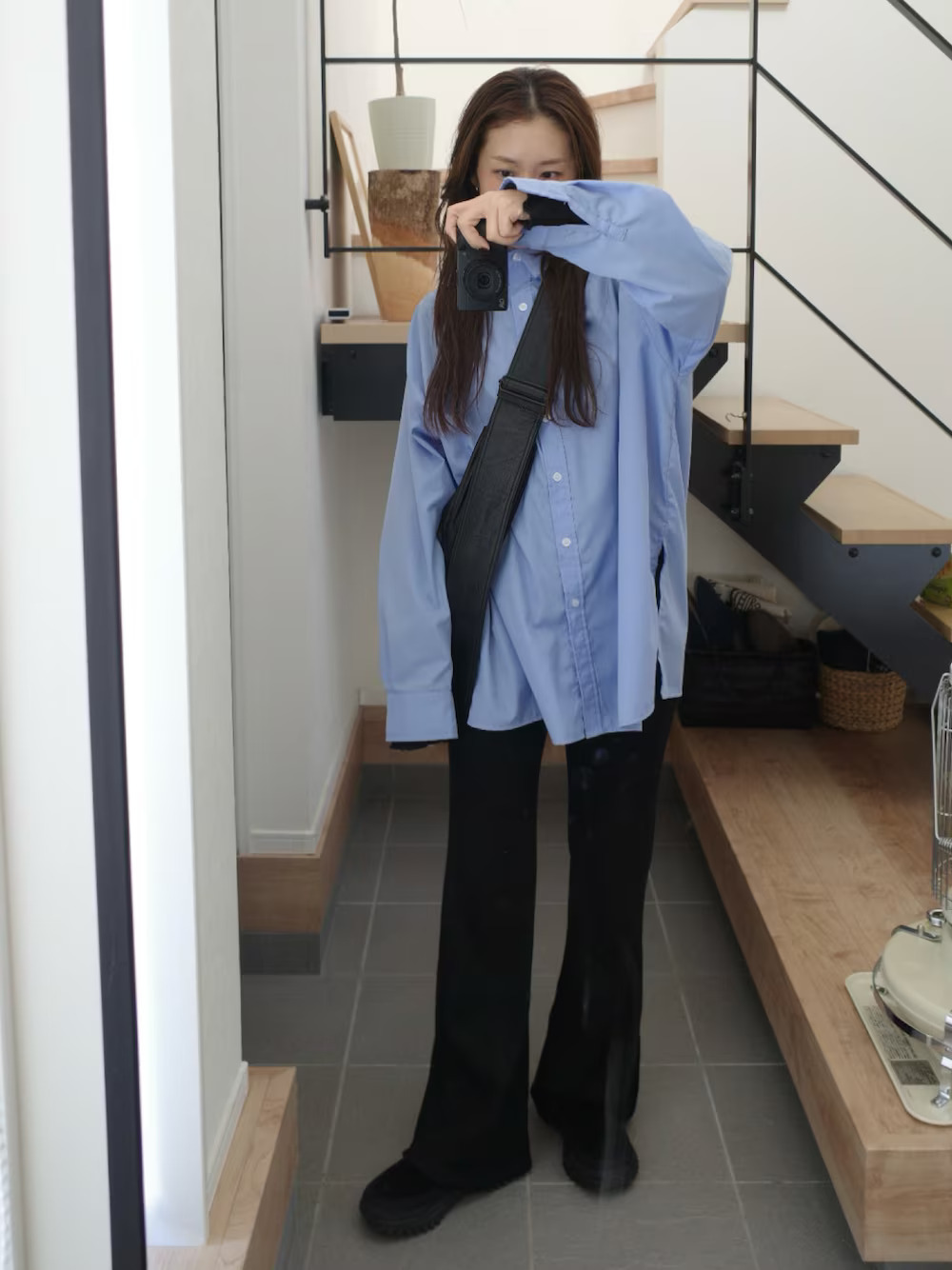 近期在日本掀起一股風潮的藍色襯衫,成為日本女生造型裡能見度很高的款式,選擇藍色襯衫 + 黑色長褲,簡單打造率性休閒的日系氣息,如果想讓中性印象更顯著的話,隨性外搭連帽外套就很好看加分。