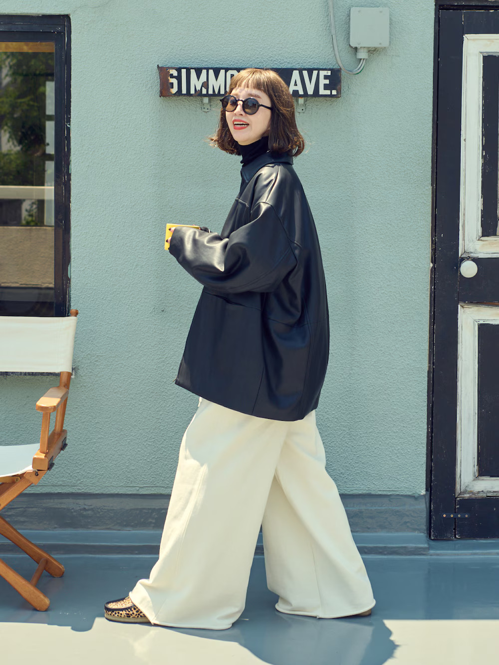 每到春季便會回歸的皮衣外套,向來是街頭時尚人士最愛的款式之一,內搭一件高領上衣,刻意露出領口的穿衣巧思,使細節更顯注目焦點,下身隨性穿寬褲或者繭型長褲就很好看加分。