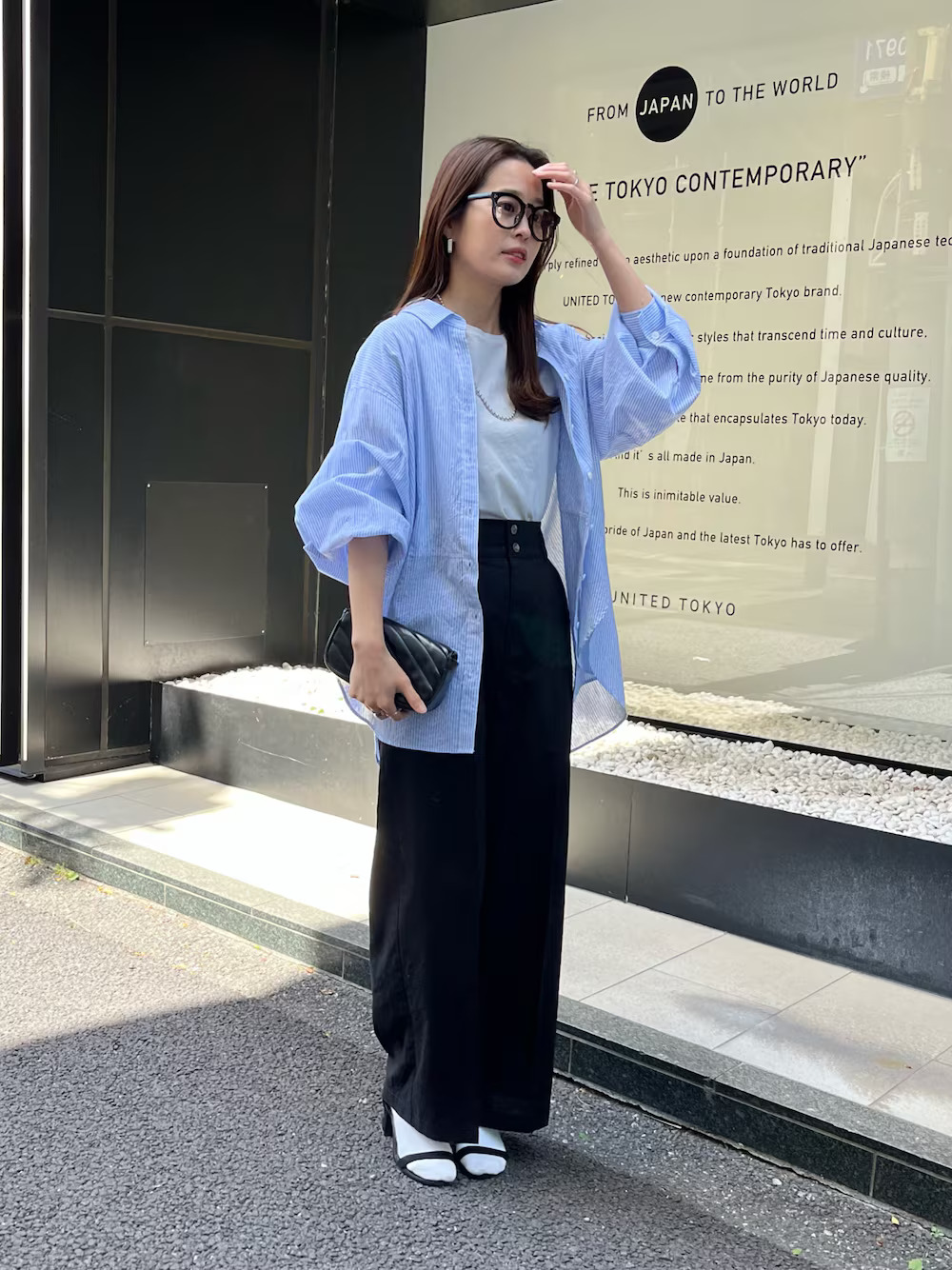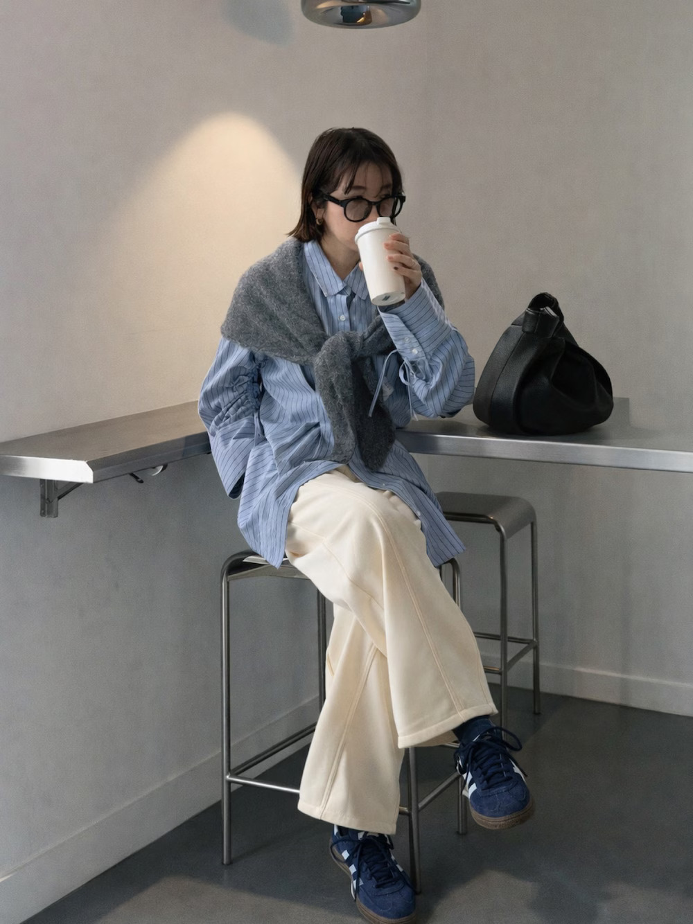 近期成為日本女生外出衣著必備的棉質長褲,舒適的面料非常適合春季時著用,融入寬管的褲型,使造型注入一股輕鬆隨性的迷人氣息,選擇藍色直條紋襯衫混合,使正式與休閒的單品,瞬間撞擊出不一樣的風格火花。