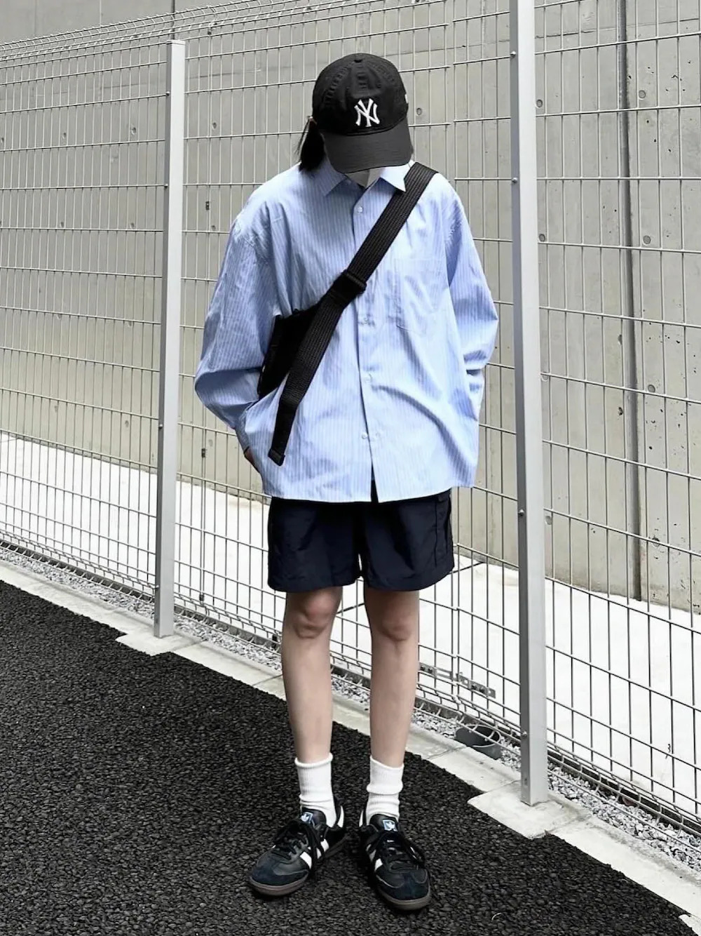 當想營造中性風格的時候,不妨嘗試選擇寬版藍色直條紋襯衫加上短褲,褲長選擇膝上且直筒的設計,便能混搭出理想的帥氣男孩氣息,再利用白色中長襪與球鞋的穿搭組合,立即呈現個性滿分的街頭印象。