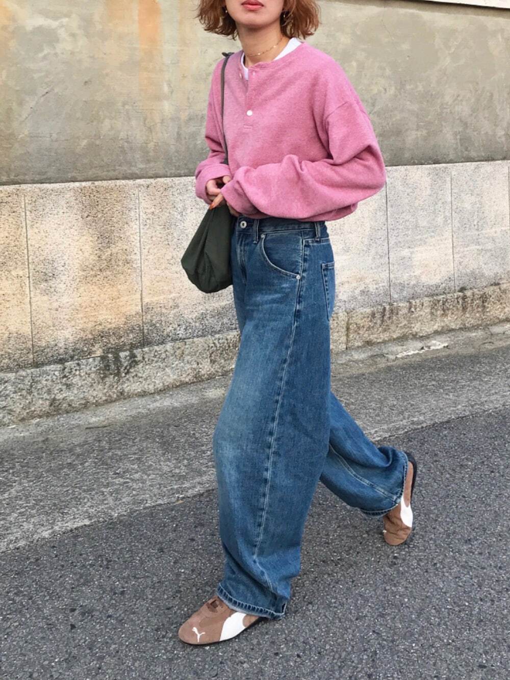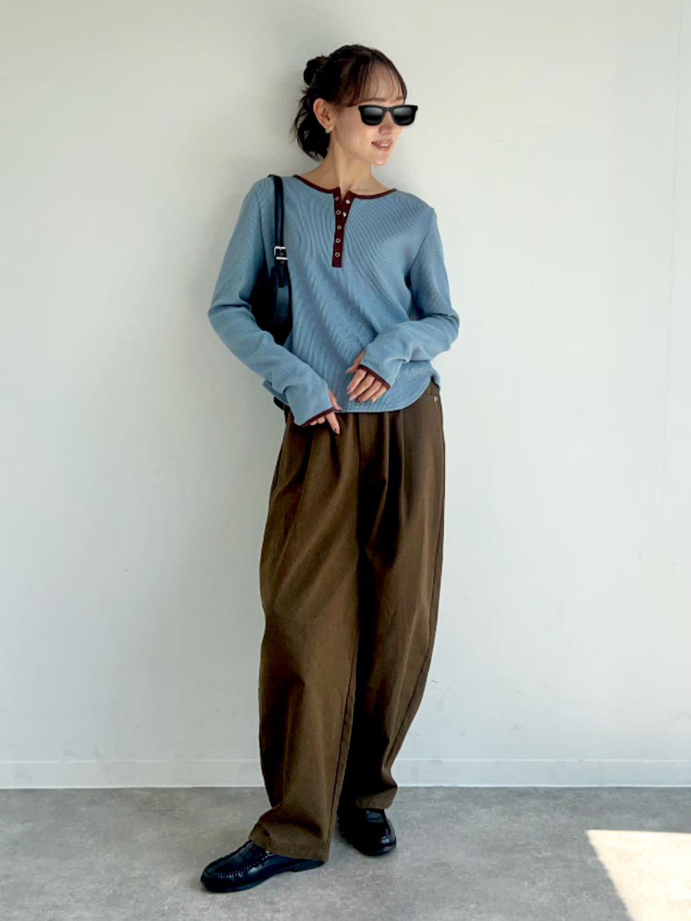 近幾年相當熱門的寬褲,成為時尚人士的最愛單品,百搭好駕馭的褲款,不僅適合拿來與任何上衣搭配之外,也能創造多元的造型風格,以亨利領上衣 + 寬褲,同時展現中性風的帥氣男孩氣息,再加上樂福鞋就很搶眼加分。