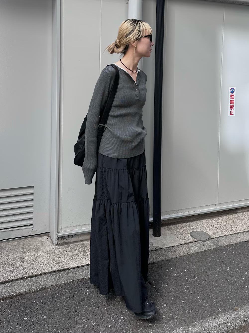 有時在選擇衣著的時候,都會擔心穿起來身型不夠修飾嗎?推薦可以跟著日本女生,以亨利領上衣和傘狀長裙混合,透過上窄下寬的穿衣組合,讓比例瞬間顯瘦又挑高,尤其傘狀裙襬能立即將下半身肉肉遮住,非常適合平常不喜歡露腿的女孩著用。