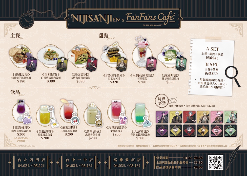FANFANS CAFÉ 推出與《 NIJISANJI EN 》合作主題聯名咖啡廳《偵探謎影 Shadows of Deduction》,將觀察與推理的概念帶入咖啡廳空間。活動將於 2026 年 4 月 2 日起於台北、台中與高雄 FANFANS CAFÉ 展開,邀請來訪的粉絲走入一間充滿調查痕跡的偵探事務所,在角色留下的謎題與紀錄之中逐步拼湊事件的真相。