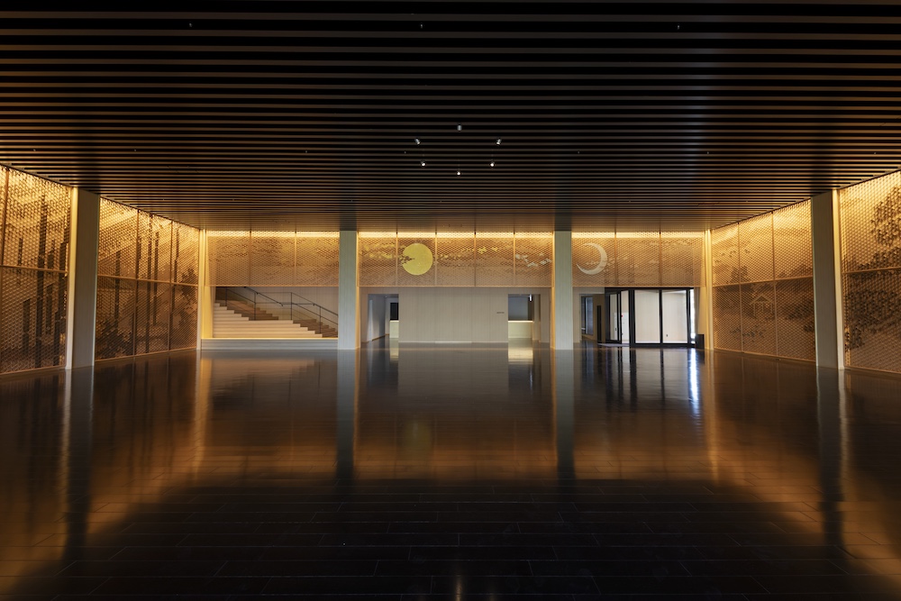 不使用任何釘子,僅憑精密木片嵌合勾勒紋樣的「組子細工」。以大量紋樣的疊合,交織出宛如繪畫般的精美創作。本作品以象徵日本庭園的「赤松」為核心,將光的移轉、風的流動、自然的蒼勁生命力,以及對訪客幸福的祈願,悉數寄託於職人之手。透過組子的細節紋理、金箔與鉑金箔的華美閃耀,疊加水墨畫的躍動感,多種技藝彼此呼應,讓整座空間彷彿化作庭園的延伸,展現極致空間美學。