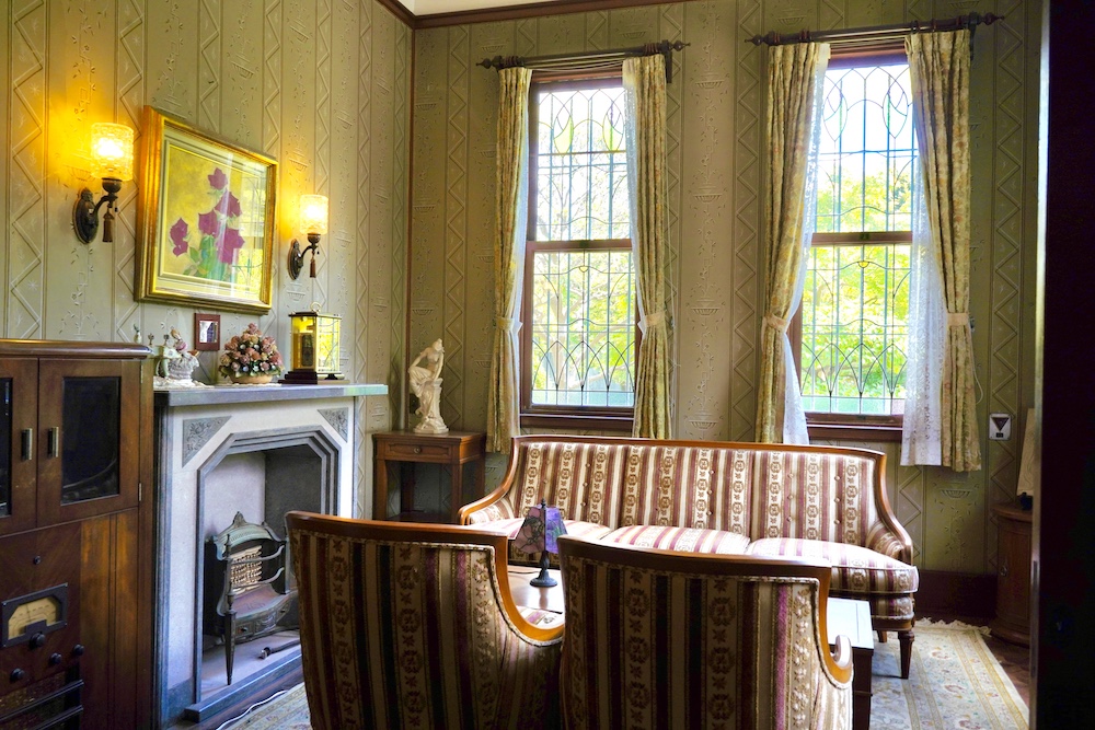 山本亭原為實業家山本榮之助的私人邸宅。這座「近代和風」建築最引人入勝之處,在於其巧妙地將傳統武家特有的「書院造」格局,與昭和初期的西方工藝優雅結合。大理石壁爐的溫潤與拼花木地板的細緻中,點綴彩繪玻璃以及晶瑩吊燈,每一處細節中,都彷彿聽見了和洋語彙輕聲交疊的時代故事。
