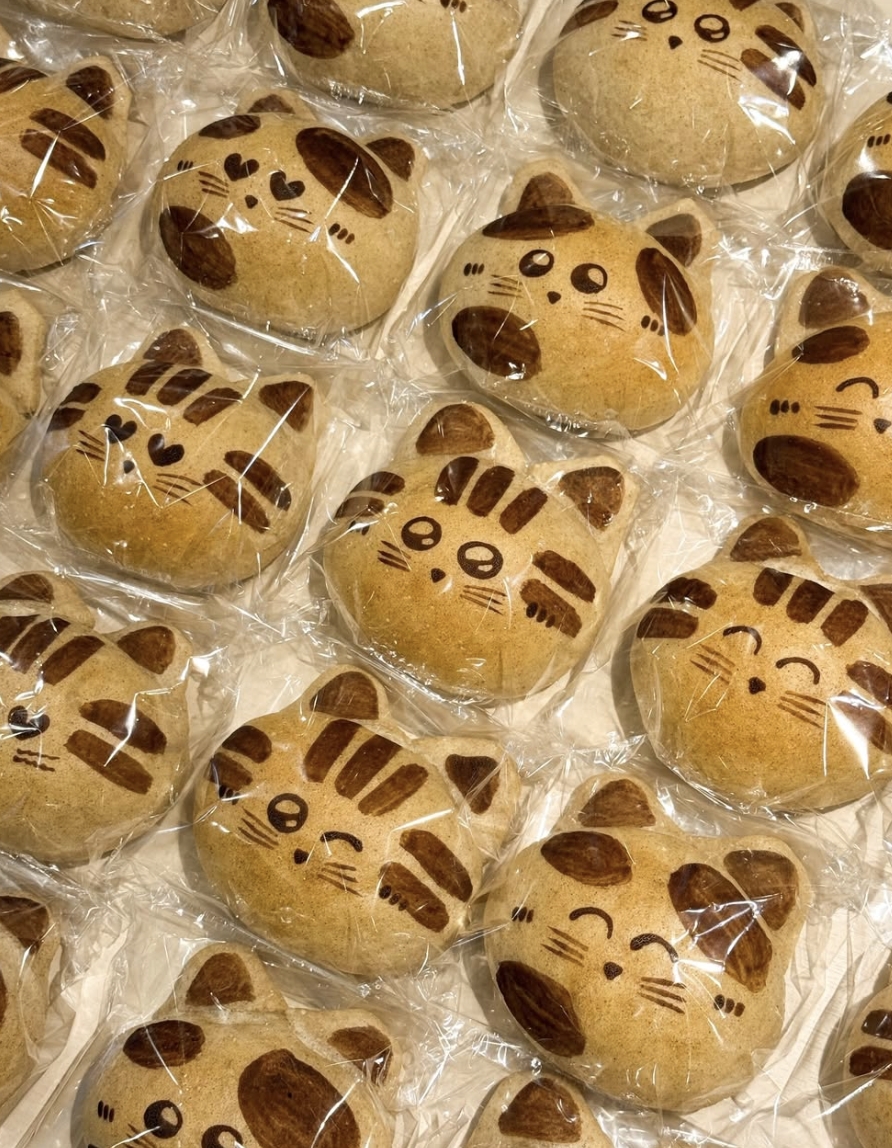 另外也有包餡的貓咪麵包,內餡則為不同口味的奶油夾心,有花生、巧克力、卡士達牛奶,以及草莓(季節限定)等奶油餡。每塊麵包的貓咪表情也不盡相同。