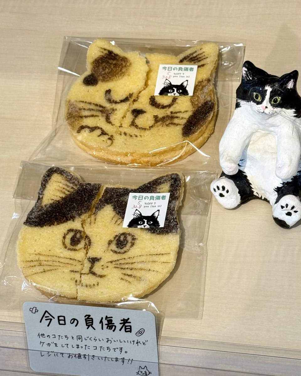 提到有著不同貓咪表情的吐司脆片餅乾,由於這個品項在烘焙過程中,偶爾會碰到餅乾碎裂的情形,因此店家會特別將這些碎掉的瑕疵餅乾挑出來,並稱之為「今日の負傷者」(意指今天烘焙出爐的瑕疵貓咪餅乾),以「受傷」來形容這些碎掉的餅乾,這樣的表達方式讓人覺得格外地可愛。