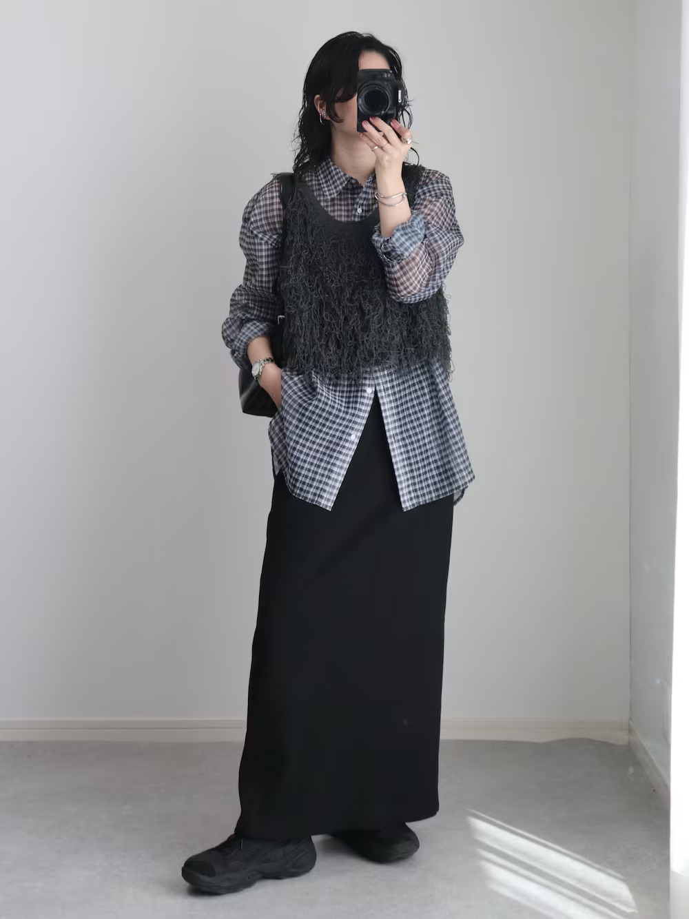 當想讓下半身製造顯瘦視覺的時候,此時可以參考日本女生選擇直筒裙混合,從襯衫、馬甲背心的穿衣組合,運用長版可以遮屁屁的單品,讓下半身瞬間顯得細長又修身,再搭個手拿小包便可有型出門。