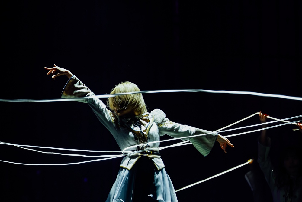 接著〈Unhappy birthday構文〉登場,宛如蛋糕蠟燭般的舞台亮起紅光,鋼琴彈奏的生日快樂歌旋律逐漸轉為詭異的不和諧小調,村井優與穿著黑白帥氣服裝的成員展現苦悶又戲劇化的舞蹈,最後「吹熄蠟燭」的動作更將黑暗的反差感拉高。