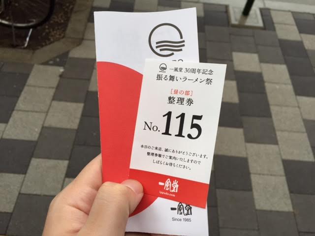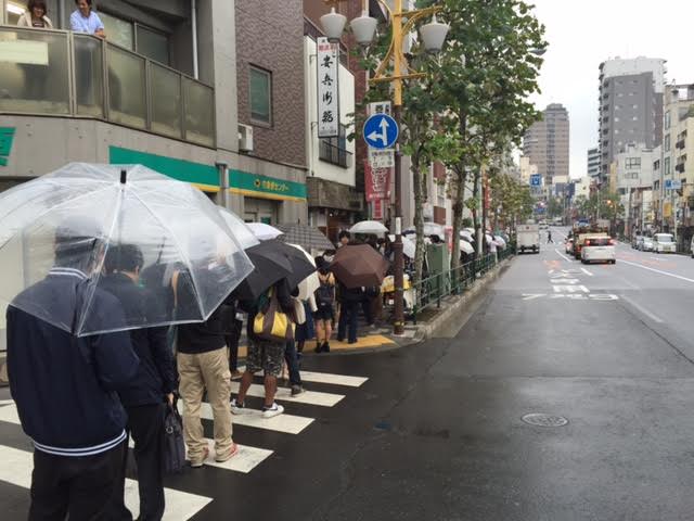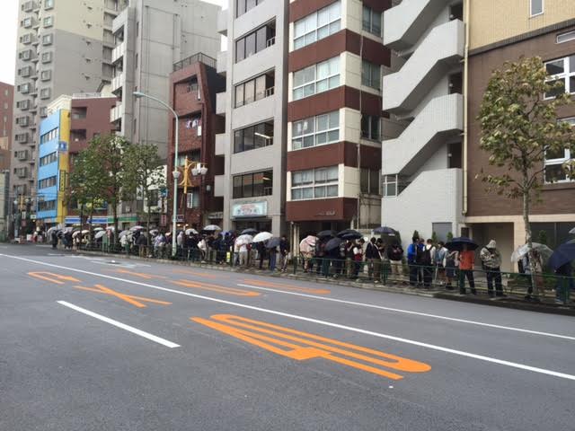 邊往的最尾端移動,數一數人數大約有100人左右。很有餘裕地拿到號碼牌。排隊時候聽到旁觀的學生們邊說著「哇~這是什麼!」「還來得及嗎?」,然後邊加入隊伍。隊伍一直延伸到由米其林刊載而為人所知的拉麵店「拉麵Yamagochi(らぁ麺やまぐち)」附近,那距離大概約有100公尺。由於人數實在太多,連附近建築物的陽台也有人出來看熱鬧。