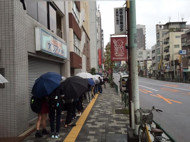 中午時段開始時間是 10點半,但是在那 30分鐘前到達時已經大排長龍。雖然那天從早上開始就下著小雨,是需要穿件外套、略感涼意的天氣。不知道是否因為高田馬場的地區性,排隊的似乎大多是大學生。小編正好趕上店員開始發號碼牌的時候。